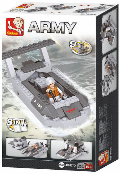 97 darabos Sluban Army – 3 az 1-ben katonai légpárnás csónak építőjáték készlet figurával. A Sluban 3 az 1-ben építőjáték készletek a 9 into 1 nagy repülőgép hordozó építőjáték szett különálló részei, vagyis a 9 különböző katonai építőjáték készlet birtokában, összeépíthetünk akár egy repülőgép hordozót is. Mitől különleges ez az építőját