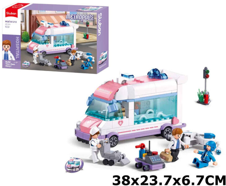 Sluban Metropolis - Mentőautó építőjáték készlet 251 darabos, színes, vidám építőjáték készlet, melyszámos kiegészítőt rejt. Ez a készlet lehetővé teszi hogy megépítsd a saját mentőautód, kiegészítve az ápolókkal. Az építőjáték készlethez 3 figura tartozik. A játék 6 éves kortól ajánlott! A Sluban készletek legnagyobb előnye, a remek ár-érték arány