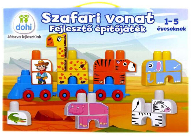 Szafari vonat fejlesztő építőjáték Szafari vonat fejlesztő építőjáték örömet szerez kisfiúknak és kislányoknak egyaránt már 12 hónapos kortól. Kék vonat piros kerekekkel mozdonyból és 2 vagonból áll, melyeken a gyerkőcök a nagy készségfejlesztő kockákat tudják szállítani. Színes kockák afrikai állatok és azok szelídítőjének nyomatával kellemes és otthon