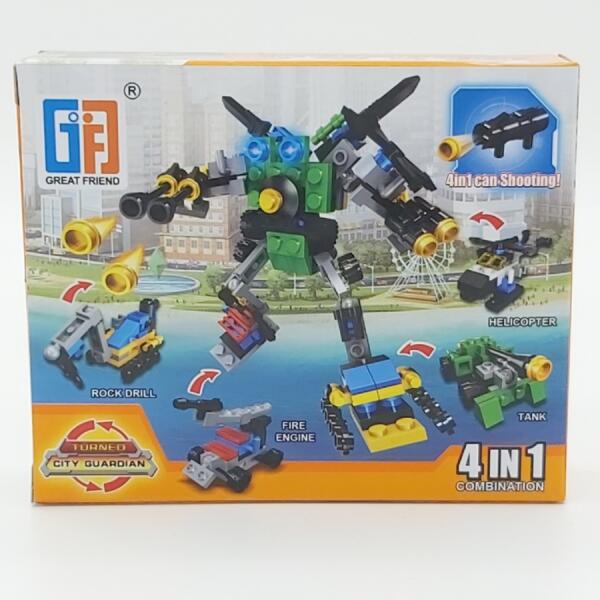 > a specifikáció színei és tartalma eltérhetnek az ábráktól 4in1 Építőjáték készlet - robot A készlettel megépíthetsz egy Tankot, egy Tűzoltó autót, egy Helikoptert, és egy Sziklafúrót. A négy típus kombinálásával egy nagy robotot készíthetsz. Csomagolás méretei: 4db, kb. 11×10cm > 6 éves kortól ajánlott