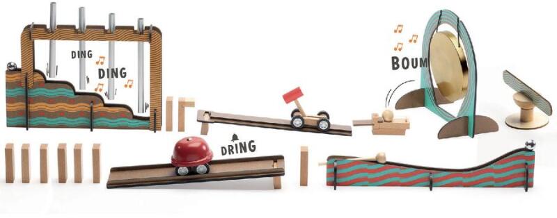 Hármas tartalmú játékÉpítőjáték, láncreakciós játék de főként gondolkodtató játék: megtapasztaltatja a súlytól függően hogyan változik a sebesség és a tartozékok közötti távolságok mit és mennyit jelentenek a láncreakciók kialakulásában. Nagyszerű, fából készült kirakós és dominóelven felépülő építőjáték pluszban a zene és a hangok témakörében