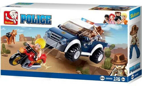 Ebből a rendőrségi Sluban építőjáték készletből egy izgalmas akció jelenet építhető össze, menekülő motoros banditával és az őt üldöző rendőrautóval. Az összeépített rendőrautó 11 cm-es. A készlet összesen 106 építőelemből áll és három figurát tartalmaz: bandita, rendőr és rendőrkutya. A Sluban készletek legnagyobb előnye, a remek ár-érték arány és