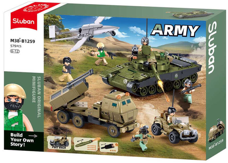 Sluban Army - Katonai hadművelet építőjáték készlet Ebből a katonai Sluban építőjáték készletből több katonai jármű építhető össze, többek között egy tank és egy mobil rakétakilövő jármű. A készlet összesen 579 építőelemből áll és 6 figurát, valamint számos kiegészítőt tartalmaz. A játékot 6 éves kor felett ajánljuk. A Sluban készletek legnagyobb el