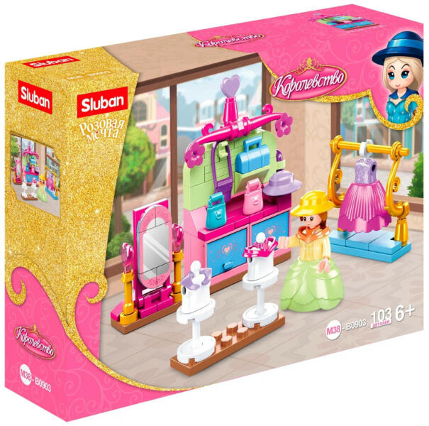 Ebből a Sluban építőjáték készletből egy ruhaszalont építhetünk össze polcokkal, próbababákkal és ruhákkal. A készlet összesen 103 építőelemből áll és egy figurát is tartalmaz. A Sluban készletek legnagyobb előnye, a remek ár-érték arány és a részletgazdag kidolgozás mellett, hogy teljes mértékben kompatibilisek a legtöbb ismert építőjáték márka elemeivel