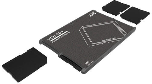 JJC MCH-SD4GR memóriakártya tartó A JJC MCH-SD4GR fekete memóriakártya-tartó rendkívül hasznos, ha több memóriakártyát használ, és könnyű és kompakt tárhelyre van szüksége. Rendkívül hasznos és kompakt memóriakártya-tartó Négy SD kártya elfér benne az előre kialakított mélyedéseknek köszönhetően Szilárdan tartja a kártyákat, de könnyen eltávolíthatók Kön