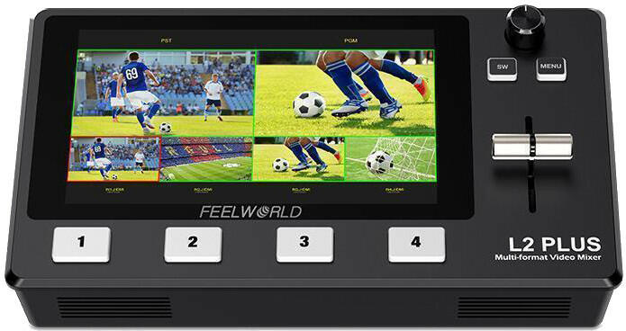 Feelworld L2 PLUS Multi Camera Video Mixer Teljes funkcionalitású többkamerás élő produkciós váltó A FEELWORLD L2 PLUS egy hordozható, teljes körű élő közvetítő és streaming megoldás. A nagyméretű 5,5 hüvelykes LCD érintőképernyő segítségével a különböző műveletek könnyen elvégezhetők egy ujjal történő megérintéssel. A 4 kamera, a PST és a PGM előnézet