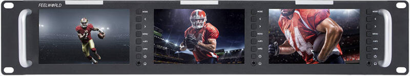 Feelworld T51-H három rack monitor (nincs SDI)A Feelworld T51-H egy ultravékony HDMI 3 RU rackbe szerelhető monitor GPIO hálózati vezérléssel, amelyet akár 3 1080p60 jel hatékony sugárzására terveztek. A T51-H képernyőnként 3G-SDI, HDMI és kompozit BNC bemenetekkel és kimenetekkel, valamint minden panelhez RCA audio bemenettel rendelkezik. 3 db 5 hüvelykes TFT képernyő 800 x 48