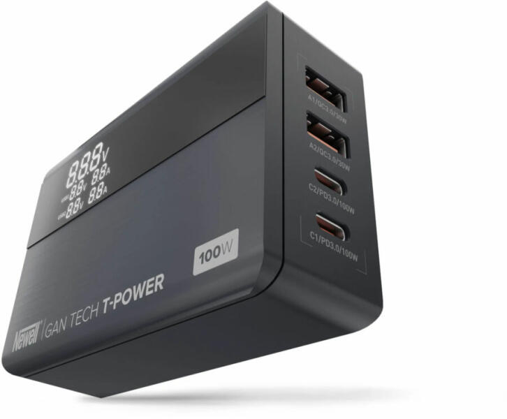 Newell GaN Tech T-power 100 W töltőA Newell GaN Tech T-power 100 W egy modern hálózati töltő, amely a szilícium alkatrészeket gallium-nitriddel helyettesíti. Ezáltal kisebb, gyorsabb és hatékonyabb, mint a korábban ismert eszközök. A töltő 2 USB-C porttal és 2 A típusú USB porttal van felszerelve. Háttérvilágítású képernyő is található rajta, amely a töltési folyama