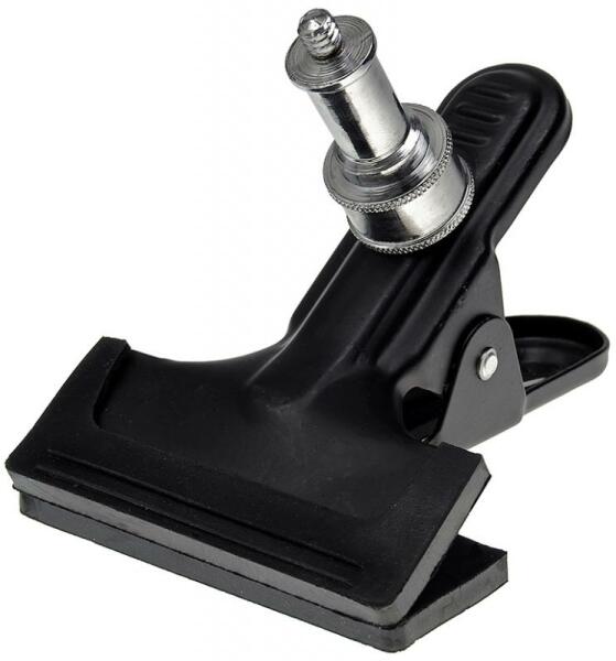 Fémből készült, gumírozott csipesz stúdióvaku, állandó fényű lámpa rögzítéséhez. Erős rugóval felszerelt csipesz, 8 cm széles. Maximum kb. 5 cm-re nyílik szét. Tárgyasztalhoz is használható, ha plusz fénnyel pl. hátulról is megvilágítanád az asztal lapját.