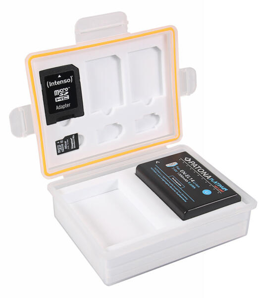 PATONA tároló doboz akkumulátorokhoz és memóriakártyákhoz A vízálló PATONA tárolódoboz egy kis "űrcsoda". Kompakt, formás és praktikus -2db akkumulátor, 3db SD és 3dbmicroSD memóriakártya is, tárolhat benne. A fedélbe tömítés van beágyazva, hogy megakadályozza a nedvesség behatolását. A doboz korszerű polipropilén anyagból készül. Vízálló műanyagból Külső m