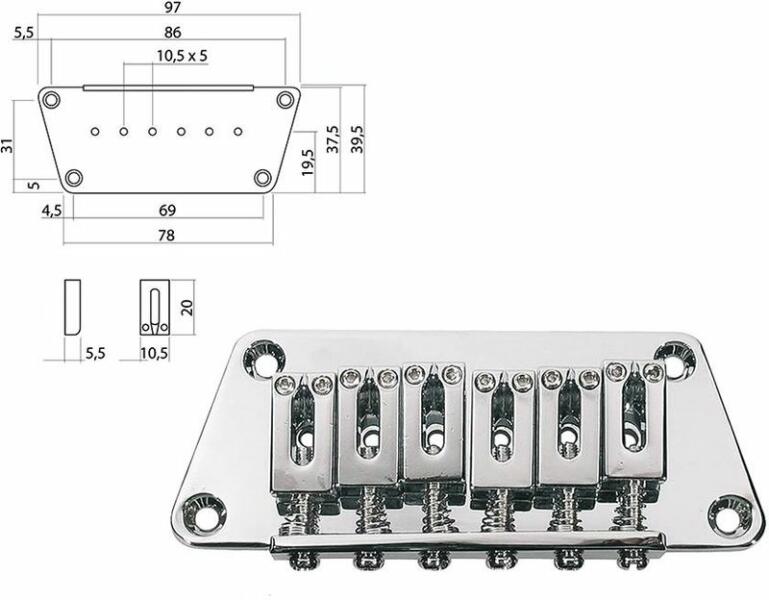 bridge-tailpiece, Stallion, pitch 10,5mm, strings though body, chrome