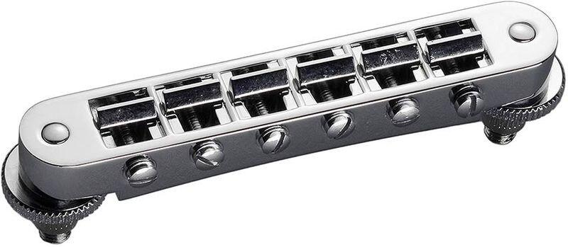 GTM tune-o-matic guitar bridge, 10,5mm spacing, 14&;quot;radius, chrome High-quality Tune-o-matic bridge for all Les Paul;* type guitars Compatible with post spacings from 74.0 - 74.5 mm Features special retainer springs to prevent bridge rattle or string buzz Saddles supplied without preconfigured string grooves allowing for individual string spacing Saddles are from brass Slant angle to be d
