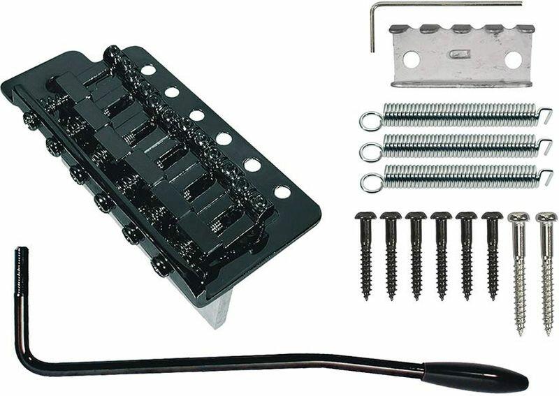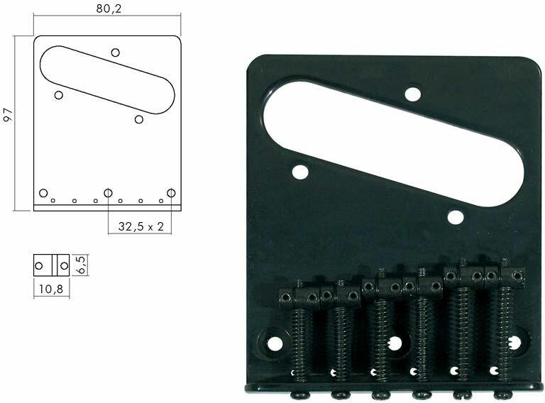 bridge-tailpiece, Teaser, grooved saddles, flat plate, strings-in-bridge or through-body, black width baseplate: 80,4mm length baseplate: 97,0mm thickness baseplate: 2,7mm toploader: yes string-through-body: yes stringspacing E-e: 54,0mm length saddle: 6,6mm width saddle: 10,8mm thickness saddle: 6,5mm finish: black mounting screws included