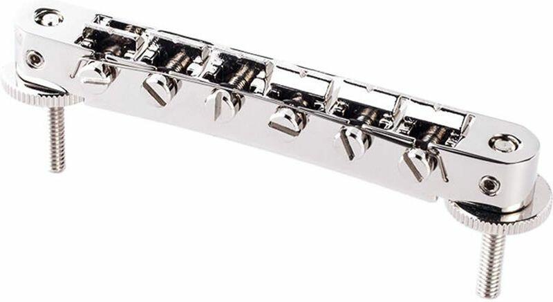 AVR2P tune-o-matic bridge with pre-notched saddles, for USA guitars, nickel - Tune-O-Matic bridge for electric guitars - exact replacement for ABR-1 style bridges - pre-notched saddles - retrofits most vintage and reissued USA guitars without modification - eliminates rattles and improves sustain - allows precise adjustment of the string height and scale through lockable saddles - better intonatio