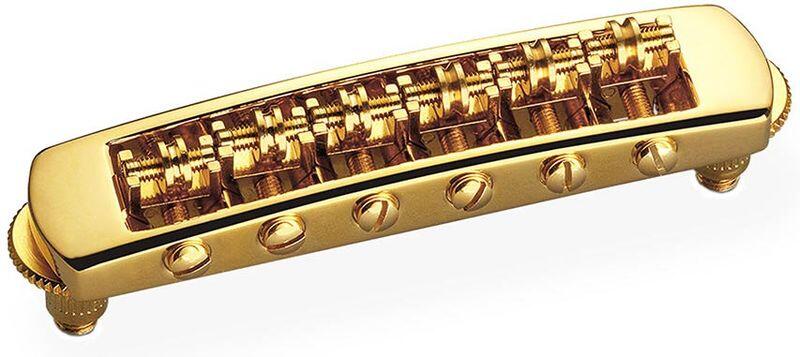 STM guitar roller bridge (for tremolo use), 10,6mm spacing, 14&;quot;radius, gold High-quality bridge for all Les Paul;* type guitars. Compatible with post spacings from 74.0 - 74.5 mm Adjustable for height, intonation and string spacing Low-friction roller saddles for excellent tuning stability –; perfect for Bigsby;* vibratos Comes with 2 different type saddle rollers to suit tone and stri