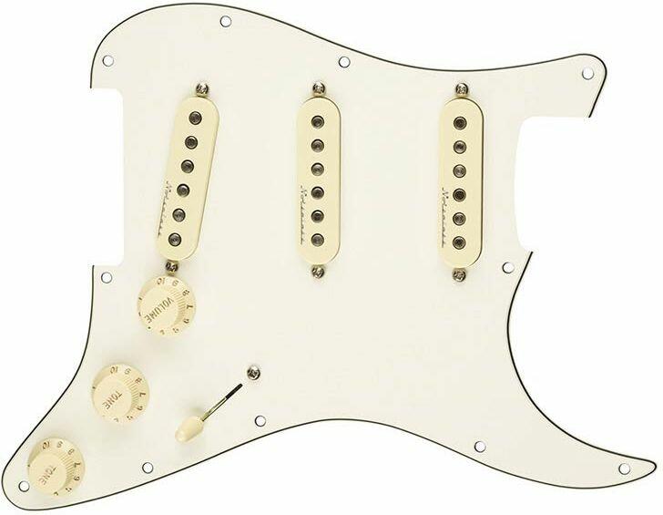 Hot Noiseless SSS, 11 screw holes, parchment Customize your tone with the Pre-Wired Stratocaster pickguards. Made with premium components in the same factory as our iconic guitars, this drop-in pickguard is easy to install. Simply remove your old guard, solder the output jack and ground wires, screw in the new guard and you’;re ready to rock with pure Fender sound. Features Hot Noiseless Pickups