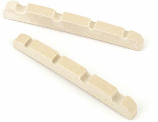 fingerboard nut, Jazz Bass, precut, 2 pieces - Set of two Micarta string nuts for American Standard Jazz Bass and other U. S. - and Mexico-made basses with 9.5&;quot;-radius fingerboards - Pre-slotted with string location grooves fro easy spacing and positioning when performing final slot filing - 9.5&;quot; (241mm) top radius, 7.25; (184mm) bottom radius - 1.53&;quot; (38.86 mm) wide
