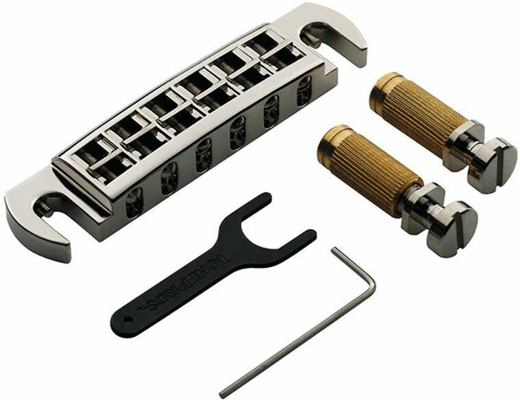 AVT2G wraparound bridge, for USA guitars, nickel - wraparound bridge for electric guitars - retrofits USA G-style guitars fitted with stud mount bridges with standard center stud spacing without modification - fully intonatable - 82.0 mm (3.228&;quot;) post distance - 52.5 mm (2.066&;quot;) string spacing - incl. TonePros SS1 Locking Studs (TP SS1 N) - incl. TonePros 'Heighten &;amp; T