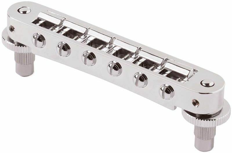 TP6 tune-o-matic bridge, for USA guitars, nickel - Tune-O-Matic bridge for electric guitars - locking Nashville style bridge allows precise adjustment of the intonation and scale through lockable saddles - retrofits most LP- and SG-style USA guitars without modification - intonation adjustment on the pickup side - small posts - un-notched saddles for professional installation - standard US threade