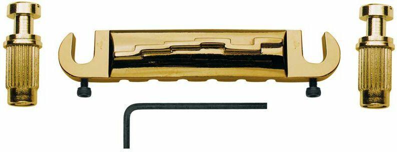 bridge-tailpiece, G-model, with studs, fixed staggered saddles, gold specifications bridge diameter anchor: 12mm length anchor: 20mm thread studs: M8 spacing studs: 81mm stringspacing B-e: 50mm radius: 12&;quot; saddles notched: no finish: gold