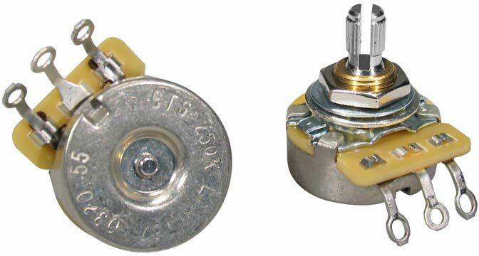 250K audio potentiometer, solid shaft, short bushing . 250, 3/8 diameter, for pickguard mount Value: Typically 250K pots are used for single coil pickups and 500K pots for humbucker pickups. The bigger the resistence value, the brighter the sound will be/ less highs will bleed off. 1MEG can be used to make humbuckers sound brighter. Taper: The taper of a pot refers to the way its resistance change