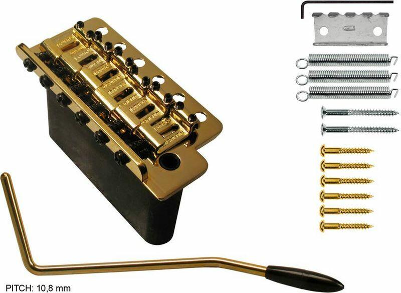 tremolo, pitch 10,8mm, with screws, zinc block, gold Since its introduction in 1954, this classic design is the most copied guitar vibrato bridge ever. The design is so simple and eminently usable it is a challenge to improve on it, but improve it Wilkinson did! Faithfully reproducing the size and weight of the original, this is a direct retro-fit for the &;quot;real thing&;quot; but with