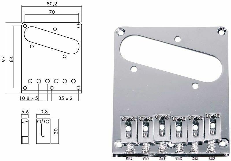 bridge-tailpiece, Teaser, block saddles, flat plate, chrome width baseplate: 80,2mm length baseplate: 97,0mm thickness baseplate: 2,7mm toploader: no string-through-body: yes stringspacing E-e: 54,0mm length saddle: 20,0mm width saddle: 10,8mm thickness saddle: 6,6mm finish: chrome mounting screws not included