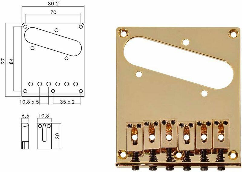 bridge-tailpiece, Teaser, block saddles, flat plate, gold width baseplate: 80,2mm length baseplate: 97,0mm thickness baseplate: 2,7mm toploader: no string-through-body: yes stringspacing E-e: 54,0mm length saddle: 20,0mm width saddle: 10,8mm thickness saddle: 6,6mm finish: gold mounting screws not included