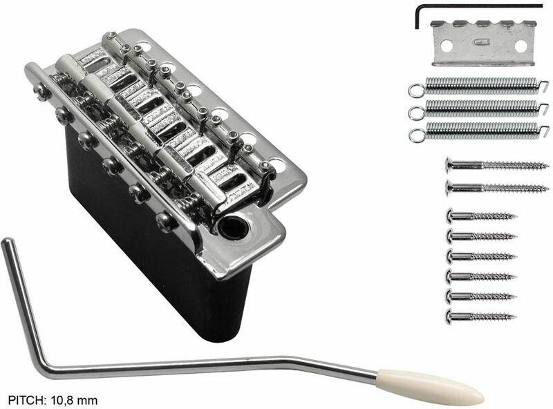 tremolo, pitch 10,8mm, with screws, solid steel block, nickel Since its introduction in 1954, this classic design is the most copied guitar vibrato bridge ever. The design is so simple and eminently usable it is a challenge to improve on it, but improve it Wilkinson did! Faithfully reproducing the size and weight of the original, this is a direct retro-fit for the &;quot;real thing&;quot;
