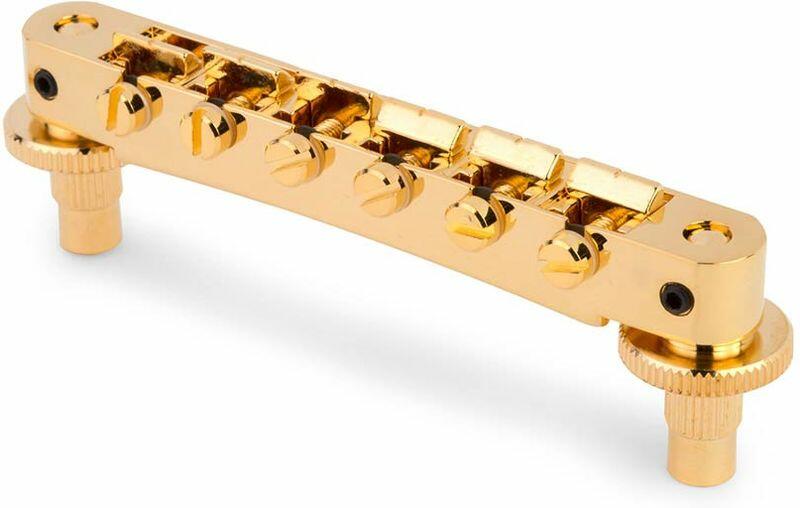 NVR2 tune-o-matic bridge, for USA guitars, gold - Tune-O-Matic bridge for electric guitars - directly retrofit all Nashville style bridges - standard Nashville style US thread posts and inserts - fits most AVR2 style posts and spacing - eliminates rattles and improves sustain - allows precise adjustment of the string height and scale through lockable saddles - 73.66 mm (2.9&;quot;) post distan