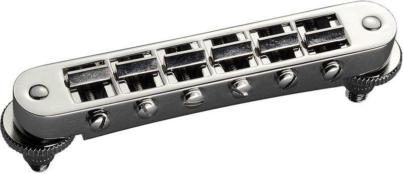 GTM tune-o-matic guitar bridge, 10,5mm spacing, 14&;quot;radius, nickel High-quality Tune-o-matic bridge for all Les Paul;* type guitars Compatible with post spacings from 74.0 - 74.5 mm Features special retainer springs to prevent bridge rattle or string buzz Saddles supplied without preconfigured string grooves allowing for individual string spacing Saddles are from brass Slant angle to be d