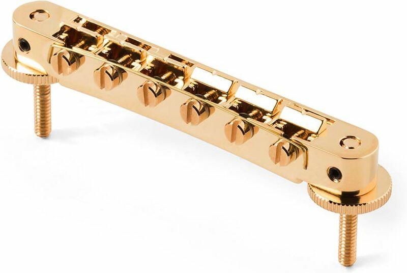 AVR2P tune-o-matic bridge with pre-notched saddles, for USA guitars, gold - Tune-O-Matic bridge for electric guitars - exact replacement for ABR-1 style bridges - pre-notched saddles - retrofits most vintage and reissued USA guitars without modification - eliminates rattles and improves sustain - allows precise adjustment of the string height and scale through lockable saddles - better intonation