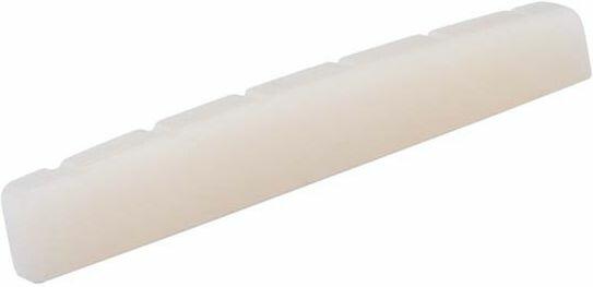 top nut for electric guitar, unbleached bone, 42,5x6,5x3x1mm, pre-filed, spacing 34,6mm Pre-filed string slots. Stringspacing 34,6mm. Flat bottom. This nut is made from unbleached bone, a long-time favourite of many luthiers. The slightly self-lubricating properties of unbleached bone as opposed to the very white bleached bone are a good reason to use this nut material. When polished, the looks of