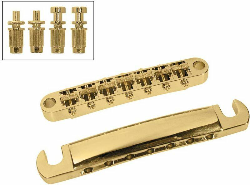 bridge and tailpiece set, 7-string, with studs, 16&;quot; radius, stringspacing 62,6mm, goldplated tune-o-matic bridge with taipiece for 7-string guitar. specifications bridge diameter anchor: 12mm length anchor: 19,5mm thread studs: M8 diameter studhole in bridge: 6mm spacing studs: 84mm stringspacing B-e: 62,6mm radius: 16; wire retainer: no saddles notched: yes finish: goldplated tailpiece