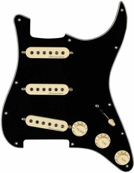 Hot Noiseless SSS, 11 screw holes, black Customize your tone with the Pre-Wired Stratocaster pickguards. Made with premium components in the same factory as our iconic guitars, this drop-in pickguard is easy to install. Simply remove your old guard, solder the output jack and ground wires, screw in the new guard and you’;re ready to rock with pure Fender sound. Features Hot Noiseless Pickups Pol