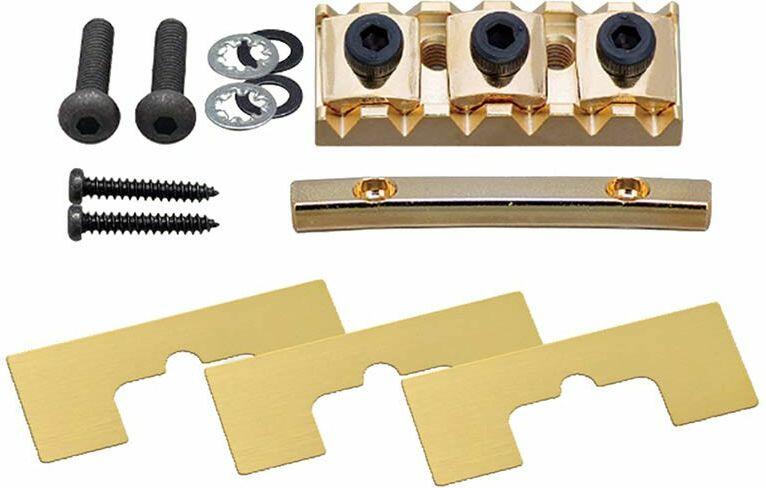 locking nut, 43mm width, 36.5mm string spacing, through neck type, gold Electric guitar locking nut with a 43 mm (1.69 &;quot;) width, 36,5 mm (1,44&;quot;) string spacing and 16; radius. Nut screws mount from back of the neck. &;lt;br&;gt;&;lt;br&;gt;Tension bar and mounting screws included. &;lt;br&;gt;&;lt;br&;gt;