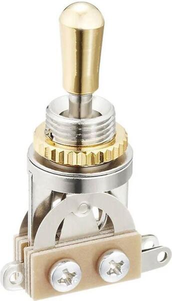 toggle switch 3-way, made in Japan, gold switch tip and nut, nickel contacts This 3-way toggle switch is a high quality pickup selector switch for two pickup guitars. It has a shorter body than the style of toggle switch installed in LP guitars so it can be used more easily in thinner body guitars like SG and EXP styles. This metric switch uses a 4 mm thread for the switch tip (not included) which
