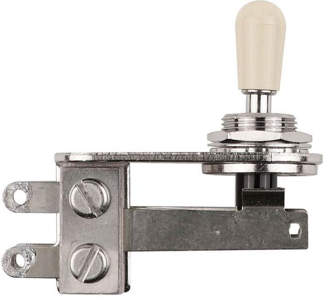 3-way toggle switch, Jazzmaster/&;#039;72 Tele, chrome with parchment tip Heavy-duty low-profile right-angle Switchcraft toggle switch Includes mounting hardware and aged white switch tip Used for pickup selection on vintage and modern Jaguar®; and Jazzmaster®; guitars Fits most vintage and modern Jaguar and Jazzmaster guitars
