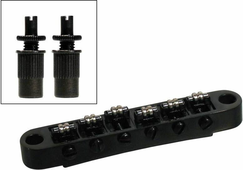 bridge for e-guitar roller bridge model, with studs, black, 15&;quot; radius, M8 thread bolts The roller parts will help keep your guitar in tune better when bending strings or using a vibrato system. specifications bridge diameter anchor: 12mm length anchor: 20mm thread studs: M8 diameter studhole in bridge: 6mm spacing studs: 74,0mm stringspacing E-e: 52mm radius: 15&;quot; wire retainer