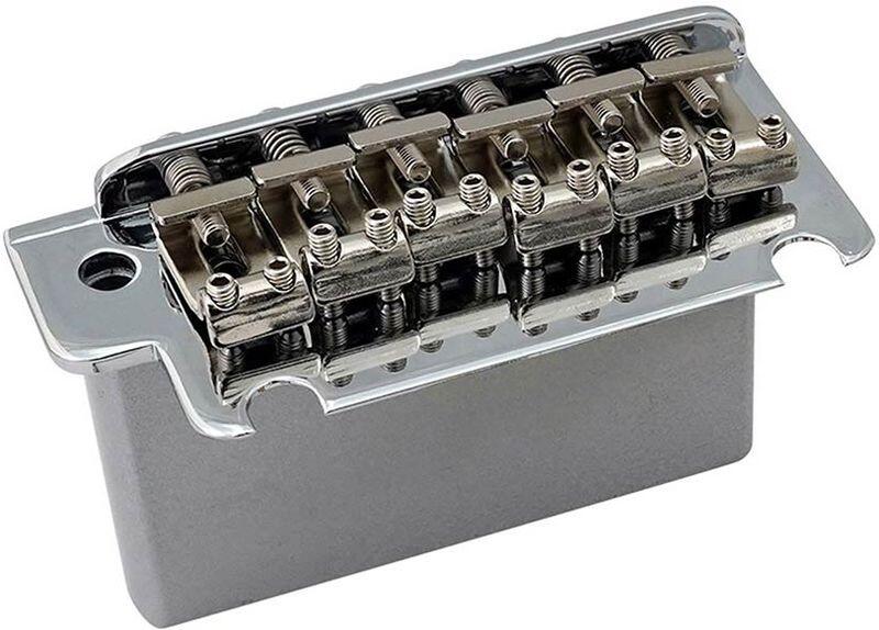 two-point synchronized tremolo bridge, stamped steel saddles, steel block, chrome Here is a new option for two-point tremolo bridges. Modern two-point synchronized tremolo design with traditional stamped bent steel saddles. You can choose steel block or zinc one. The spacings for strings and studs are the same as Gotoh 510 tremolo bridges. The new tremolo bridges are made in Japan and the quality
