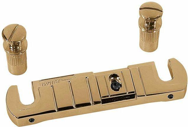 bridge-tailpiece, G-model, with studs, adjustable GB saddle, gold Direct tone, intonation possibilities for B and G string. specifications bridge diameter anchor: 12mm length anchor: 20mm thread studs: M8 spacing studs: 81mm stringspacing B-e: 52mm radius: 20&;quot; saddles notched: no finish: gold