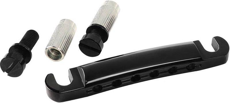 tailpiece for guitar, LP-model, with studs and anchors, black zinc tailpiece longer studs, less wide studs : 25 mm x 11,3 mm. M8. See attached technical drawing