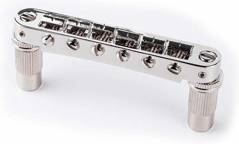 aluminum tune-o-matic bridge, metric/for import guitars, bell brass saddles, nickel - Tune-O-Matic bridge for electric guitars - made of aluminum with bell-brass saddles and brass posts - retrofits most guitars with metric hardware without modification - intonation adjustment with flathead screwdriver on the pickup side - allows precise adjustment of the string height and scale through lockable sa