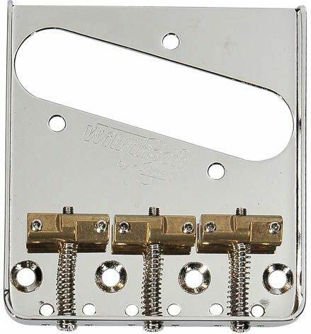 bridge-tailpiece Teaser, pitch 10,8mm, staggered brass saddles, nickel Dimensions: - Bridge plate: 86mm (l) x 77mm (w) - Distance outer body mounting screws (heart to heart): 65mm - String spacing: 54mm