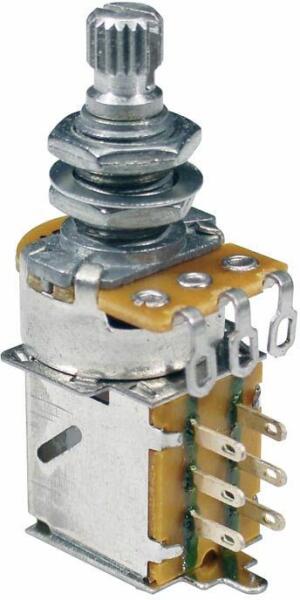500K linear (tone) push-pull potentiometer, 10mm. bushing, M8x0,75 thread, made in Korea Value: Typically 250K pots are used for single coil pickups and 500K pots for humbucker pickups. The bigger the resistence value, the brighter the sound will be/ less highs will bleed off. 1MEG can be used to make humbuckers sound brighter. Taper: The taper of a pot refers to the way its resistance changes as
