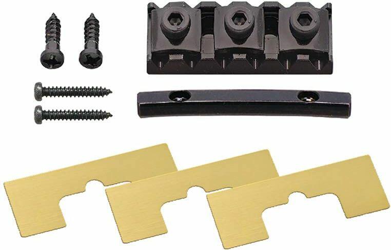 locking nut, 43mm width, 36.5mm string spacing, top mount type, black Electric guitar locking nut with a 43 mm (1.69 &;quot;) width, 36,5 mm (1,44&;quot;) string spacing and 16; radius. Nut screws mount from front of neck. &;lt;br&;gt;&;lt;br&;gt;Tension bar and mounting screws included. &;lt;br&;gt;&;lt;br&;gt;