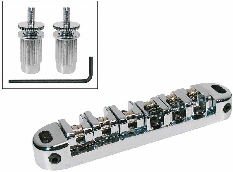 bridge for e-guitar roller bridge model, with studs, 14&;quot; radius, stringspacing 50,4mm, chrome The roller parts will help keep your guitar in tune better when bending strings or using a vibrato system. The bridge can be locked to the posts for improved sustain. specifications bridge diameter anchor: 12mm length anchor: 19,5mm thread studs: M8 diameter studhole in bridge: 8x4mm spacing stu