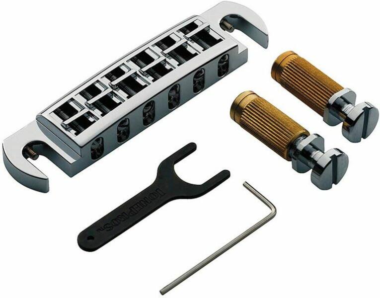 AVT2G wraparound bridge, for USA guitars, chrome - wraparound bridge for electric guitars - retrofits USA G-style guitars fitted with stud mount bridges with standard center stud spacing without modification - fully intonatable - 82.0 mm (3.228&;quot;) post distance - 52.5 mm (2.066&;quot;) string spacing - incl. TonePros SS1 Locking Studs (TP SS1 C) - incl. TonePros 'Heighten &;amp; T