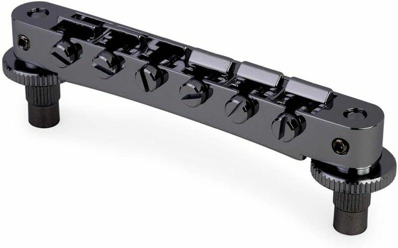 NVR2 tune-o-matic bridge, for USA guitars, black - Tune-O-Matic bridge for electric guitars - directly retrofit all Nashville style bridges - standard Nashville style US thread posts and inserts - fits most AVR2 style posts and spacing - eliminates rattles and improves sustain - allows precise adjustment of the string height and scale through lockable saddles - 73.66 mm (2.9&;quot;) post dista