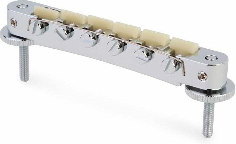 AVR2G tune-o-matic bridge, for USA guitars, G Formula saddles, chrome - Tune-O-Matic bridge for electric guitars - exact replacement for ABR-1 style bridges - special designed 'G Formula' saddles based on the original vintage Nylon 66 saddle material - saddles retain the tone of the original Nylon 66 saddles, but add other hi-tech ingredients that provide a new 'slippery' surface that prevents str